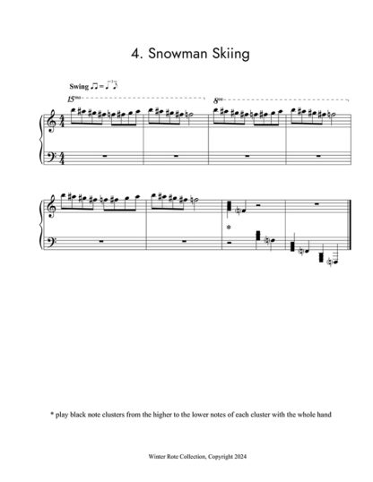 Free sample page of Snowman Skiing, one of the pieces from the Winter Rote Collection! Snowman Skiing centers around the three black notes as students “ski” all the way down the piano!