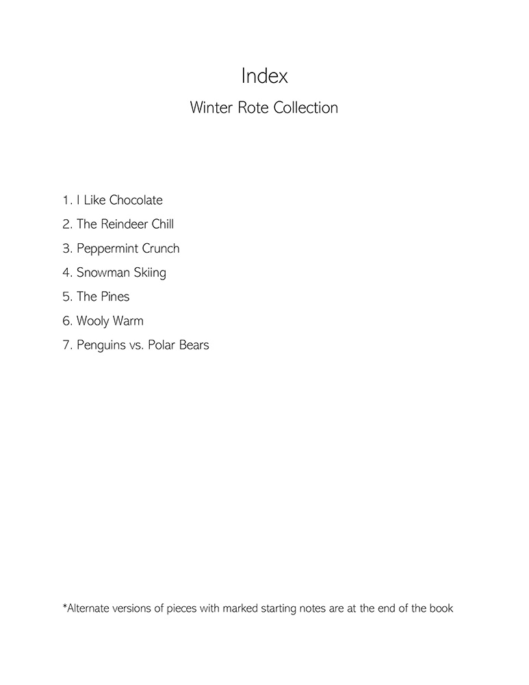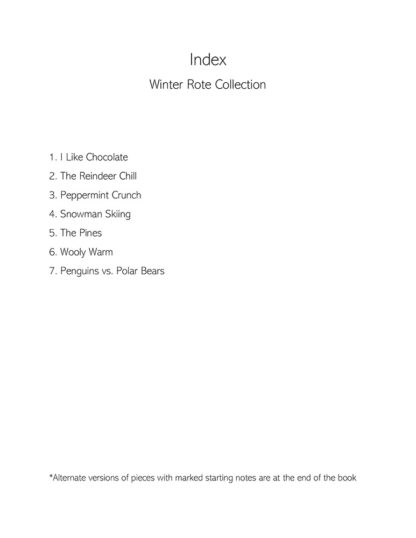 Winter Rote Collection is a set of 7 rote piano pieces created for beginner students! Pieces are in a variety of moods from upbeat and jazzy to reflective and beautiful and more! The whole range of the piano is used throughout the set! Students can use one finger for the easier pieces to work on developing a balanced arm and then use both hands for the harder pieces. Student pages do not have written notation because they are intended to be taught by rote. There is a blank keyboard diagram on each page so that students can mark starting notes themselves to aid in memory. This collection also includes all of the pieces in notated form for teacher reference. All of the pieces in this collection are available to listen to on the Winter Rote Collection video playlist here: https://www.youtube.com/@rootsmusic88