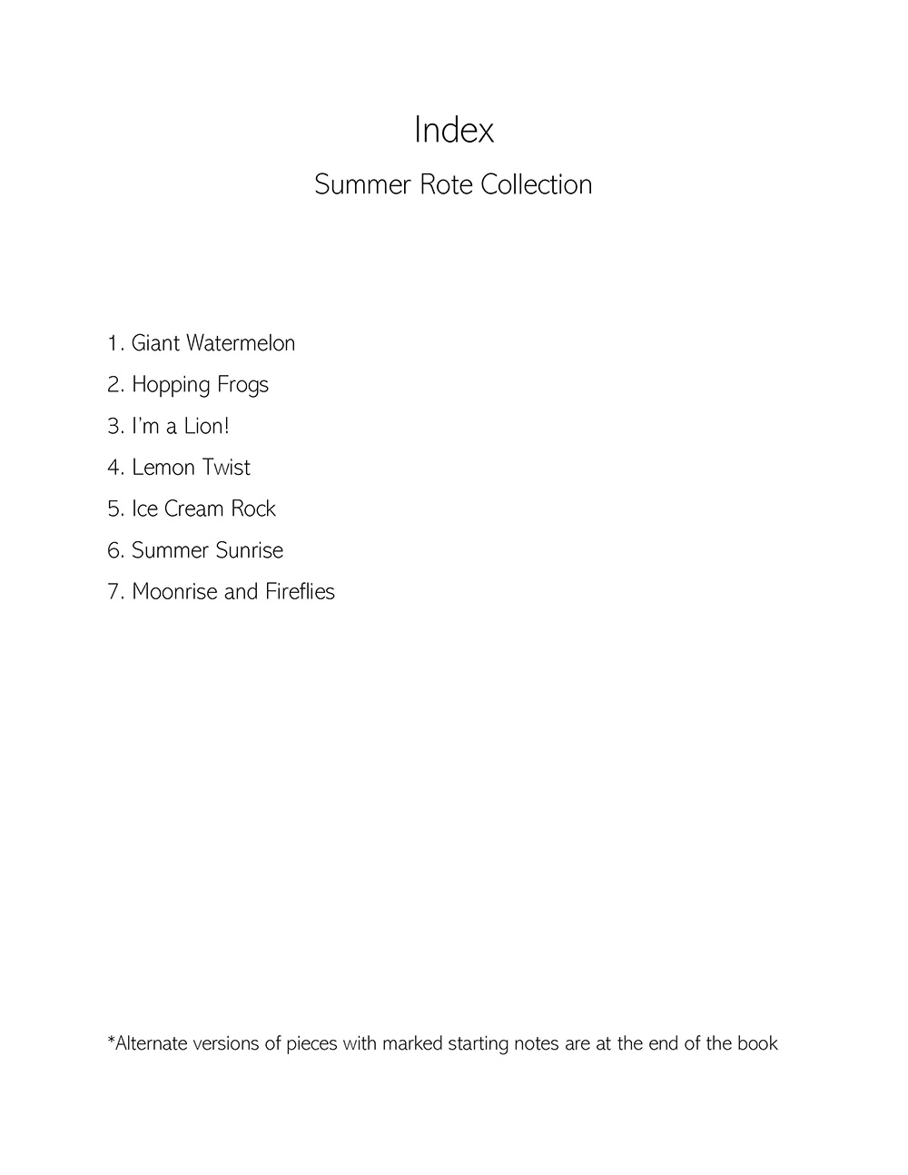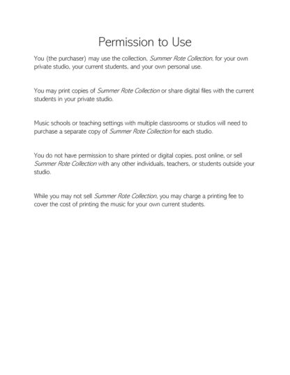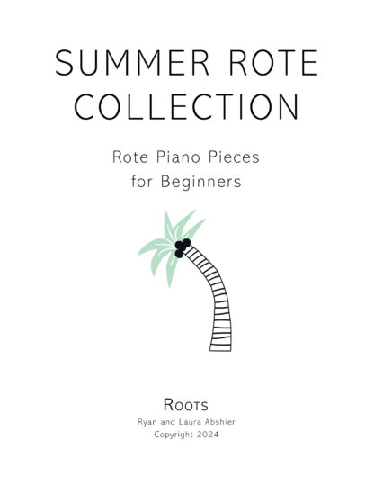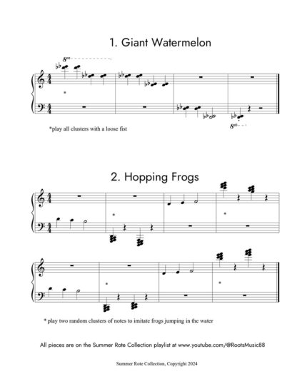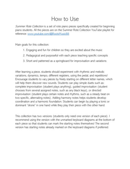 Summer Rote Collection is a set of 7 rote piano pieces created for beginner students! Pieces range from jazzy, regal, beautiful and more! The set includes a walking piece and many improvisational opportunities, as well as major, minor, and pentatonic selections! The whole range of the piano is used throughout the set. Students can use one finger for the easier pieces to work on developing a balanced arm and then use both hands for the harder pieces. Student pages do not have written notation because they are intended to be taught by rote. There is a blank keyboard diagram on each page so that students can mark starting notes themselves to aid in memory. This collection also includes all of the pieces in notated form for teacher reference. All of the pieces in this collection are available to listen to on the Summer Rote Collection video playlist here: https://www.youtube.com/@rootsmusic88