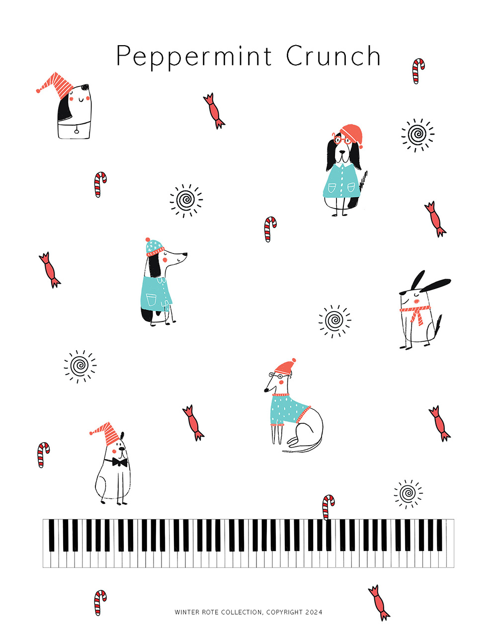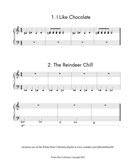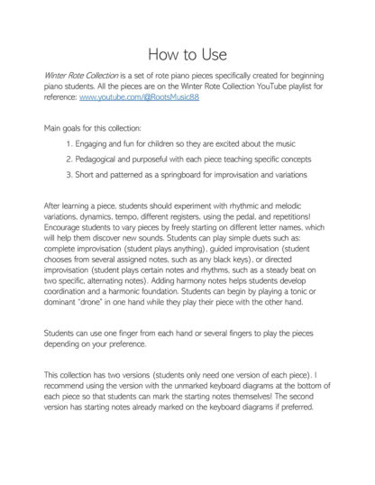 Winter Rote Collection is a set of 7 rote piano pieces created for beginner students! Pieces are in a variety of moods from upbeat and jazzy to reflective and beautiful and more! The whole range of the piano is used throughout the set! Students can use one finger for the easier pieces to work on developing a balanced arm and then use both hands for the harder pieces. Student pages do not have written notation because they are intended to be taught by rote. There is a blank keyboard diagram on each page so that students can mark starting notes themselves to aid in memory. This collection also includes all of the pieces in notated form for teacher reference. All of the pieces in this collection are available to listen to on the Winter Rote Collection video playlist here: https://www.youtube.com/@rootsmusic88